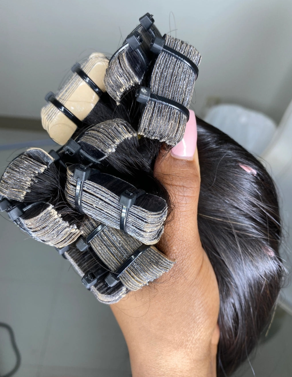 Tape in exxtensions are seamless exxtensions that give you versatility, length and fullness with detection. Exxtensions are pre- taped wefts that are attached to your hair. Our exxtensions come in Raw Vietnamese, Body Wavy, Yaky Straight and Burmese Curly. Our exxtensions include 50pcs per bundle. It typically takes 80 pcs. (Two bundles) to complete a full head. For complete fullness you can use more. Exxtensions are great for clients with fine, medium and thick hair. You can color your exxtensions to your desired color of choice.